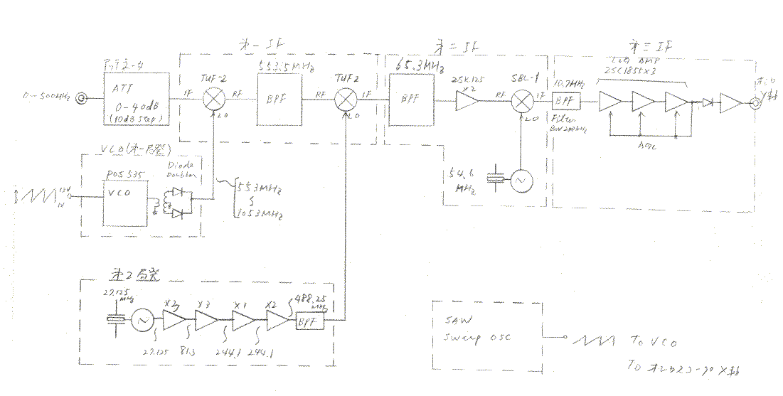 秋月のスペアナユニットが発売される前に自作したものです。オシロスコープを接続して500MHzまでのスペクトラムを表示します。ダイナミックレンジは40dB程度しか取れませんでしたが、発振器の調整等に威力を発揮しました。はっきり言ってこのクラスの自作は相当技術が要求されスペアナなしで作るのは大変でした。