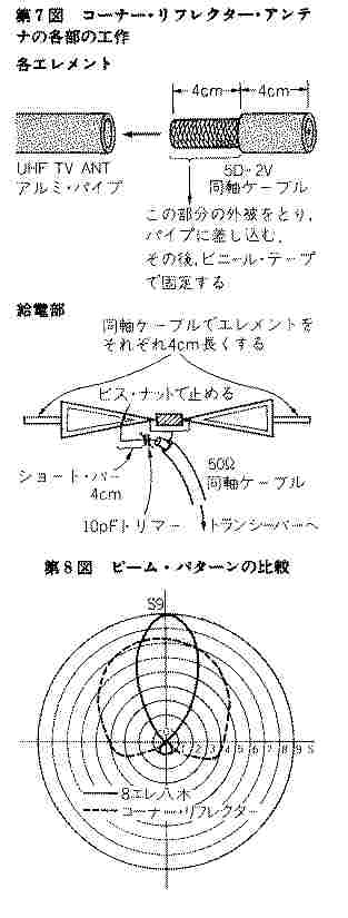 給電部はガンマ・マッチとしました。SWRはバンド内1.5以下となっています.このアンテナと市販の8エレとの指向性上比較を策8図に示します.利得は6〜7dBですがサイド方向の局もよく人感します.これであちこちのRBBSに手軽にコネクトできるようになりました.
